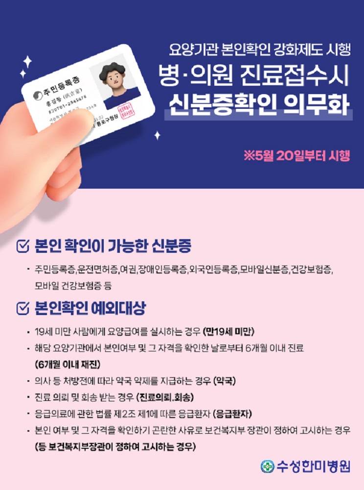 2024년 5월 20일부터 의료기관 진료 접수시 신분증 확인 의무화가 시행 됩니다.